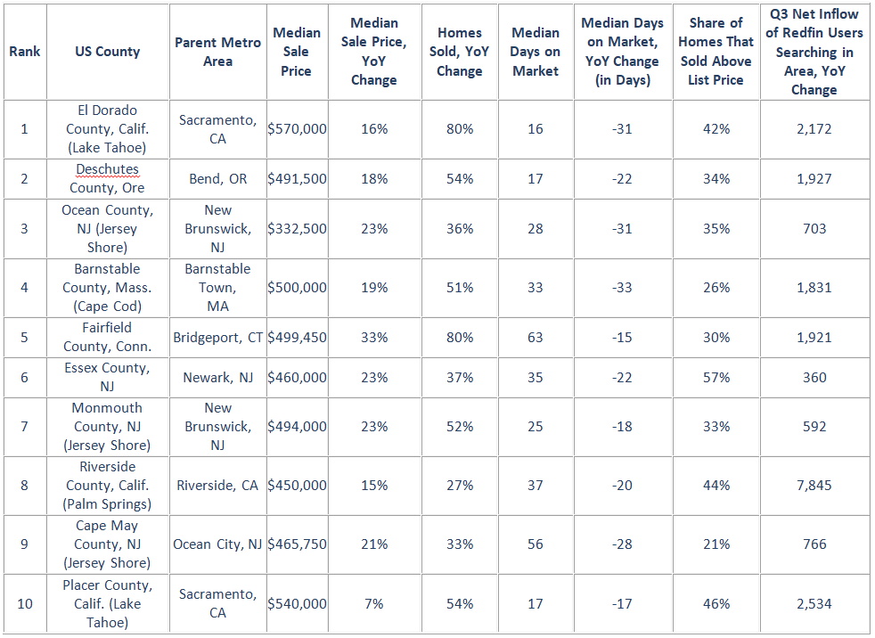 The net inflow of Redfin.com users searching online for homes in each county during the third quarter also factored into the rankings.